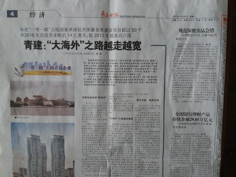 近日,“一带一路”国际合作高峰论坛在北京召开,提出将“一带一路”建成和平、繁荣、开放、创新、文明之路。作为青岛企业走出去的典型代表之一,青建将继续积极参与“一带一路”建设,着力向“海外投资、建设、运营、贸易一体化服务价值链的组织者和领导者”目标迈进。