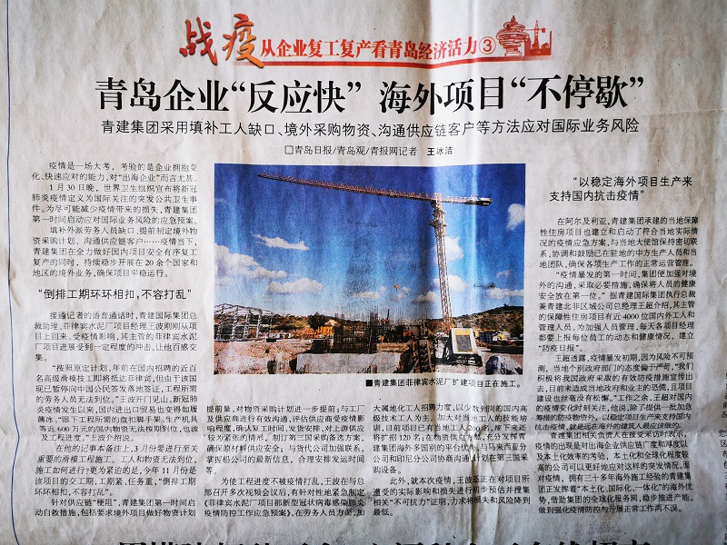 2月16日,青岛日报以“青岛企业“反应快”海外项目“不停歇”为题,报道了集团采用填补工人缺口、境外采购物资、沟通供应链客人等方法英规国际业务风险。